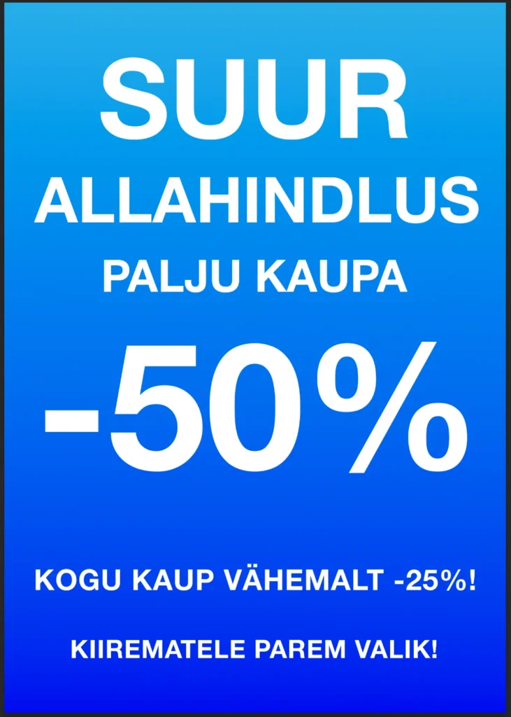 Kampaaniad ja reklaam PÖIALPOISIS SUUR ALLAHINDLUS PALJU KAUPA -50% Kagukeskuses nüüd ka Venipak pakiautomaat. Kagukeskus tuledesäras 03.2024